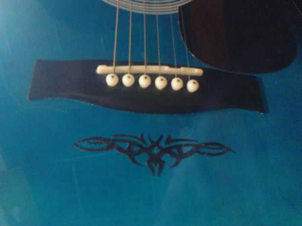 Vuelta su diseño por lo que la superficie blanca quede hacia arriba. Toma su cola y dab alrededor de la superficie y coloque cuidadosamente sobre su guitarra.