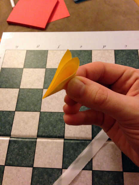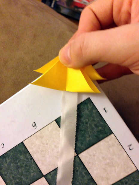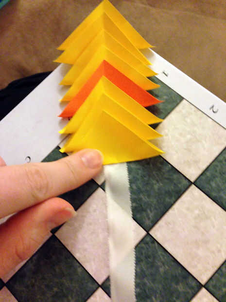 Luego, tomar las plazas que fueron cortadas en el paso anterior y doblarlas en el ángulo en triángulos. Asegúrese de que no abata la diagonal entera. Entonces, hacer un triángulo más veces en el centro para crear una costura. (Véase las fotos). Doblar cada pieza una por una y una vez doblado, lugar en el pedazo de cinta con el punto superior del Triángulo apuntando hacia arriba.