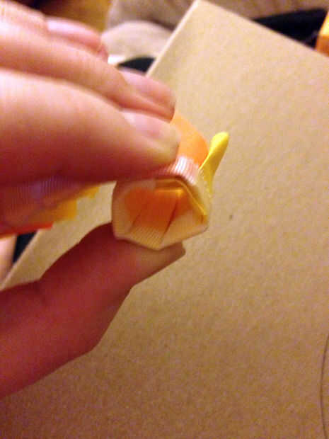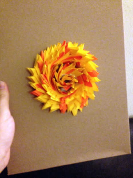 Luego, ya me estaba haciendo un patrón circular, creó un círculo en el extremo de la tira y había grabado a sí mismo. Puesto que el papel es algo rígido, no se queda sin cinta. Colocar la cinta donde no se muestran en la fotografía final.