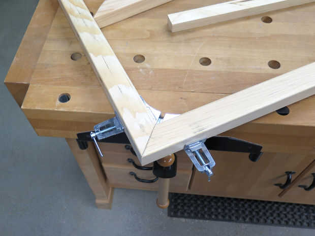 Ahora es el momento para pegar las esquinas. Esquina de inglete uso abrazaderas a cada lado del pegamento. Después de seco recomienda el uso de un tornillo o clavo para hacer una carpintería más fuerte