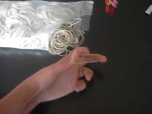 Colocar una goma en el dedo pulgar y el dedo medio y estirarlo hacia fuera. Ahora carga la munición encajando en la banda de goma con el pliegue. Encontrar a una víctima, tire y suelte!