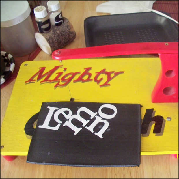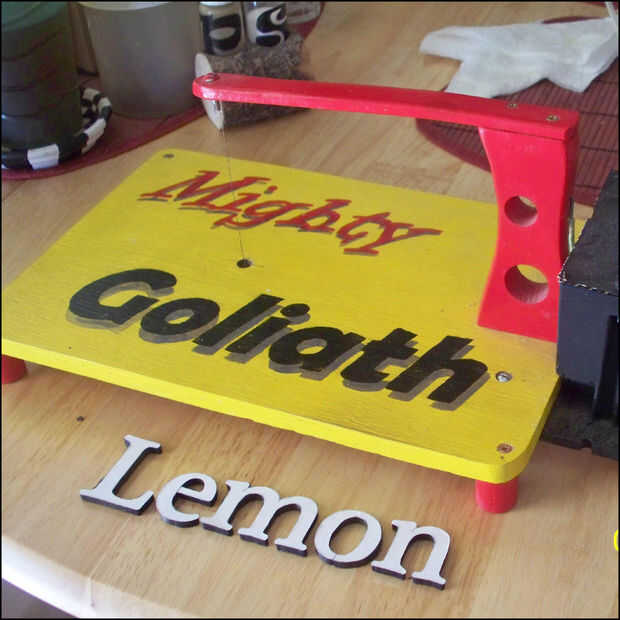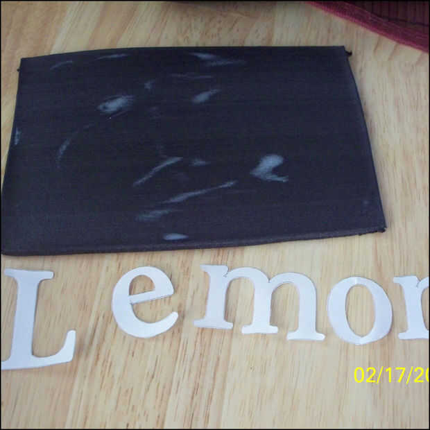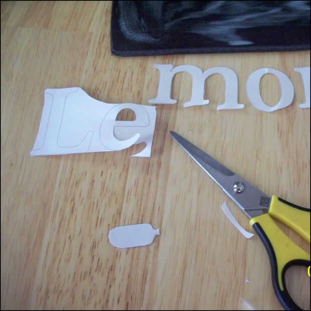 voy en mi procesador de texto, seleccione un tipo de letra del tamaño adecuado e imprimir la palabra que necesito. Las letras son cortar con tijeras y pegadas en las piezas de stryrofoam negro, el tipo que viene en bandejas de carne que puedes comprar en la tienda. Para este instructivo, estoy mostrando "limón" como mis palabras para el formulario. Previamente había terminado "aguacate", pero no tomó fotos de eso. Si usted está interesado en la máquina de hotwire, poderoso Goliat, ver este instructivo: