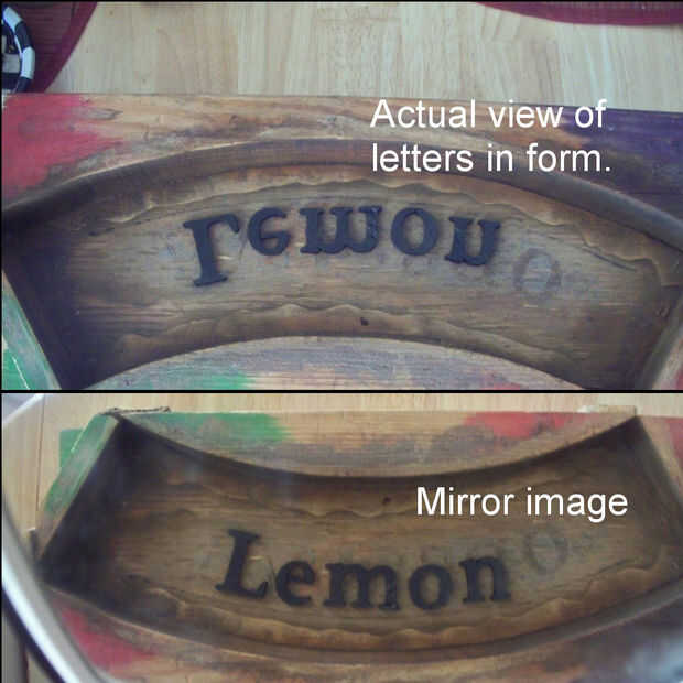 I poner las letras en la forma y alinear lo mejor que pueda. Utilizar un espejo para revisar la alineación de mi, y cuando esté satisfecho, delinear las Letras con un lápiz o un rotulador marcador. Así, cuando pegue, es fácil de reemplazar en el lugar adecuado. He encontrado que un pegajoso pegamento funciona mejor para este tipo de aplicación.