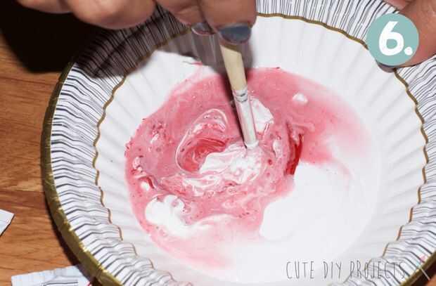 Después de que hayas limpiado tu cepillo, se usa para mezclar con cuidado la pintura roja y blanca en la placa de papel.