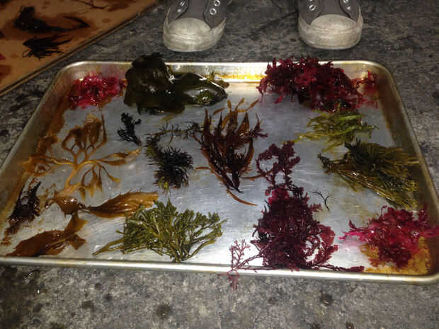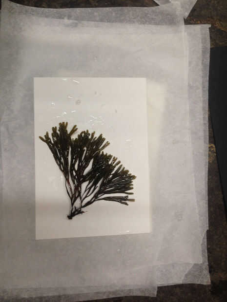 Suavemente sacuda el exceso de agua de cada pieza de algas (debe todavía ser un poco húmedo aunque) y arreglarlos sin embargo usted quiere en su papel de acuarela! Intente hacer las algas como bidimensional como sea posible y desenredar las cuchillas de hoja-como unos de los otros para que usted puede tipo de abanico les con el fin de mostrar más de la estructura. Si la pieza tiene un holdfast grande, usted puede cortar un poco con las tijeras hacer squishable. En general, usted probablemente sorprenderá cómo aplastar cosas! Los pneumatocysts grande en el quelpo, las burbujas de aire que sus hojas cerca de la luz, la boya se aplasta completamente y perfecto sin ninguna modificación, a pesar de cómo 3D son.