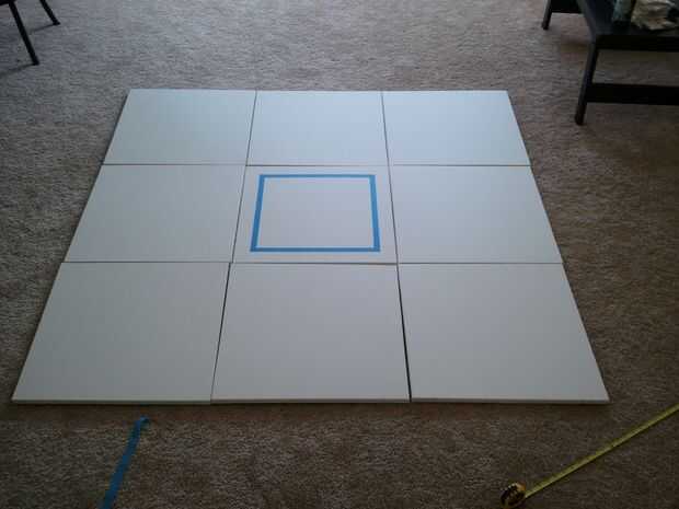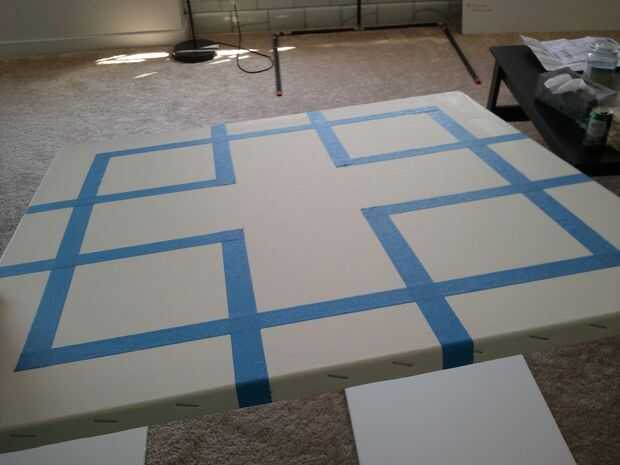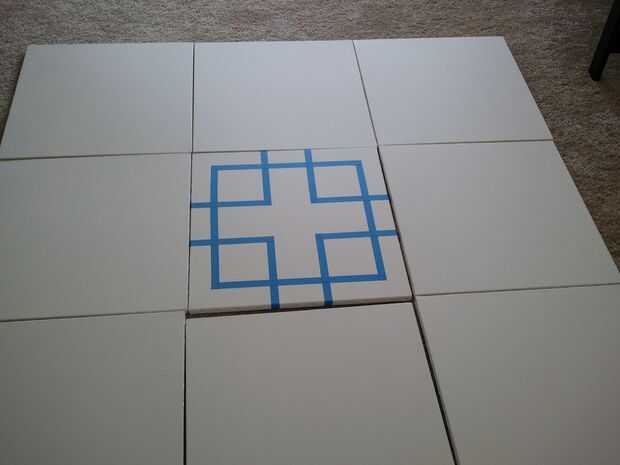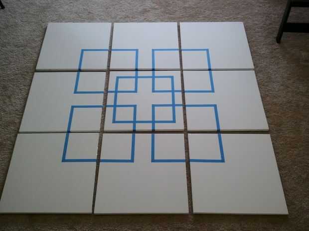 El primer paso es reunir sus lonas y cinta adhesiva el diseño (a finalmente ser los lienzos de la pintura y quitar la cinta, dejando el diseño en negativo). Para esta obra usé 9 lienzos cada 16 "x 16" (o algo así) de Utrecht (muy barato, como $6 un pedazo más o menos). Y sí, ser "cerebral" quien soy, mide todas las distancias para asegurarse de que era todo simétrica. Recuerde que las marcas de lápiz son increíblemente difíciles de borrar de lona, así que cuando usted pone sus marcas, asegúrese de que no cinta sobre ellos (por lo que te terminan cubiertos por pintura).