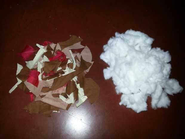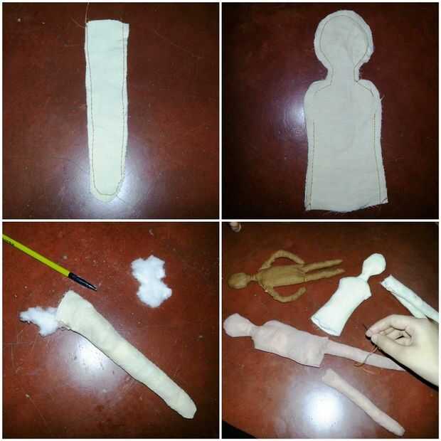 Cuando tengas los recortes de tela listos para hacer los títeres, coser 2 pedazos similares a mantener abierto un lado y rellene con residuos de telas o telas de algodón. Coser todas las partes del cuerpo juntos (Asegúrese de que las manos son flexibles, por lo que puede hacerlas moverse fácilmente con la cadena o cable). Vea la foto.