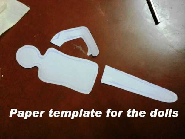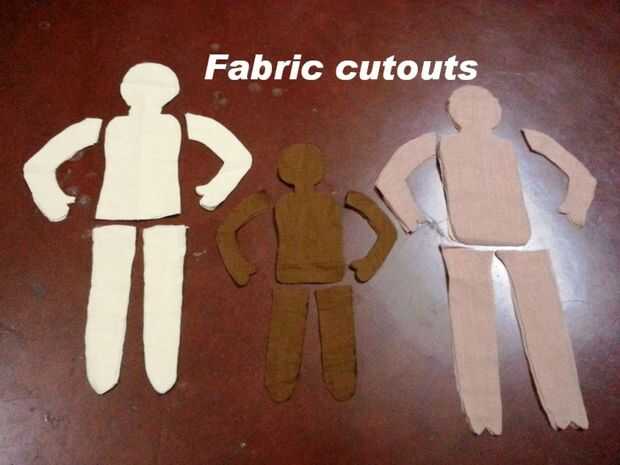 Hacer una plantilla para las partes del cuerpo y cortar hacia fuera. Usarlos para hacer la tela recortes. El número de recortes de tela para cada títeres son: