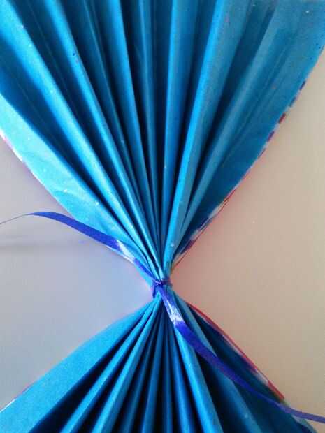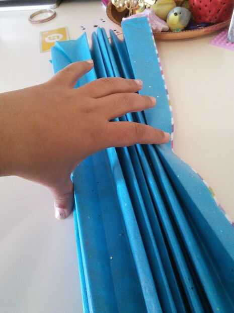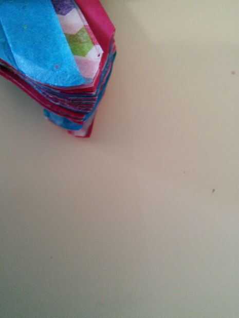 1. he tomado 2 hojas 4 diferentes de papel de colores. La parte inferior que son 2 azul, luego pongo 2 hoja de papel de tejido diseño geométrico, entonces superior con 2 hoja blanca impresa de papel por último app 2 hojas de papel de seda rosa. puede utilizar estos patrones de color o alguna te gusta. Incluso solo tejido color hojas funcionan bien, pero usar 8 hojas.