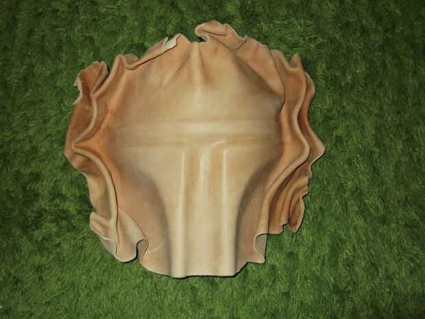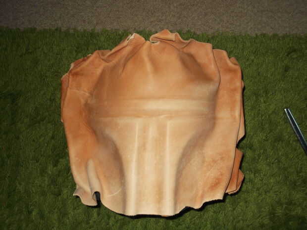Moje el cuero bajo el grifo y limpie cualquier exceso de agua. Luego el cuero alrededor del casco para obtener la forma del molde. Los bordes de la piel pueden ser irregulares y luego liberar para arriba.