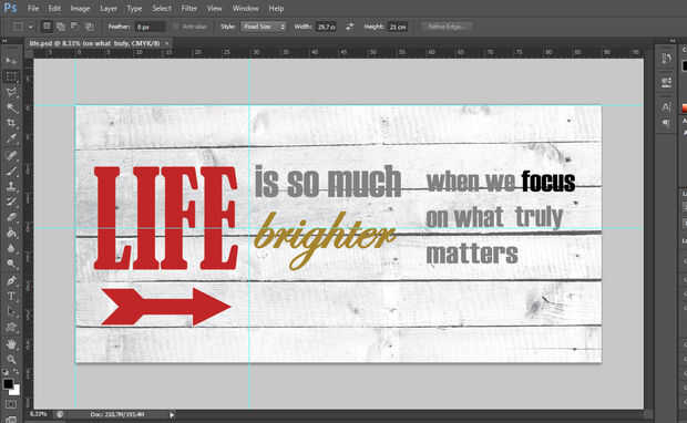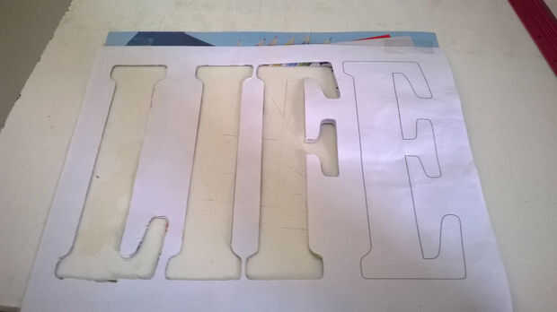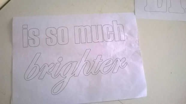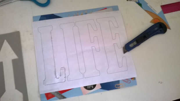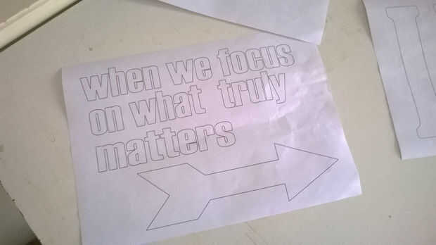 "La vida es mucho más brillante cuando nos enfocamos en lo que realmente importa"Usé Photoshop en una escala de 1:1 planificar el resultado final. Elija las fuentes que se pueden cortar fácilmente alrededor de los bordes. No tenga miedo de ser creativo y elegir más de uno. Imprimir las palabras en el papel A4 y luego los pegadas en la cartulina. Usé una herramienta de corte de papel simple para cortar alrededor de los bordes y una regla. Seguí cada carta que cortan, porque algunos de ellos podrían ser útiles más adelante. Sea paciente y tenga cuidado al usar la herramienta de corte. Puede usar guantes para proteger sus dedos de conseguir cortar accidentalmente.