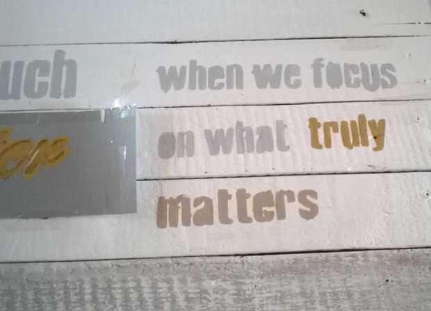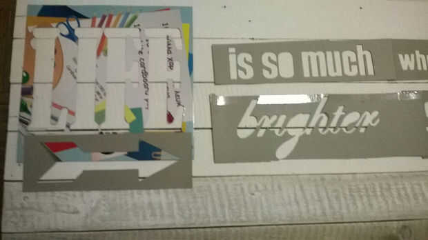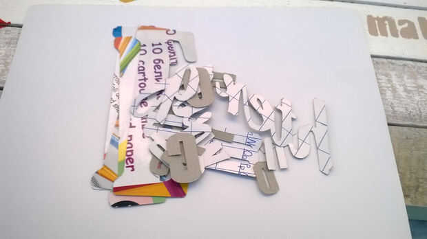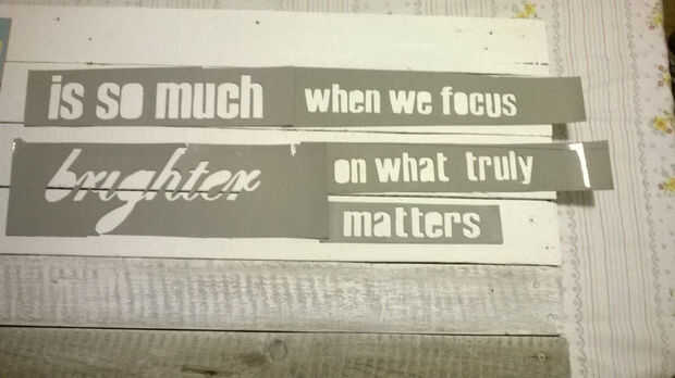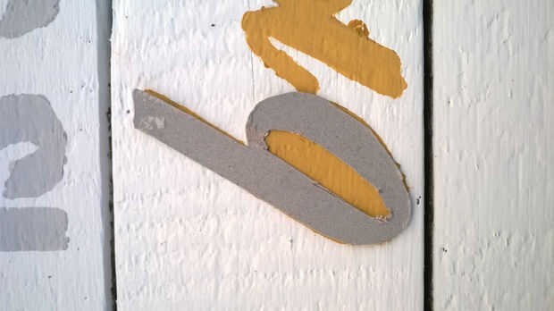 Utilice la plantilla de cartulina que acaba de crear para pintar las palabras sobre las tablas. Cinta sobre las juntas y utilizar un simple pincel para pintar las palabras. En cuanto a los colores, otra vez, utilicé pintura acrílica a base de agua.