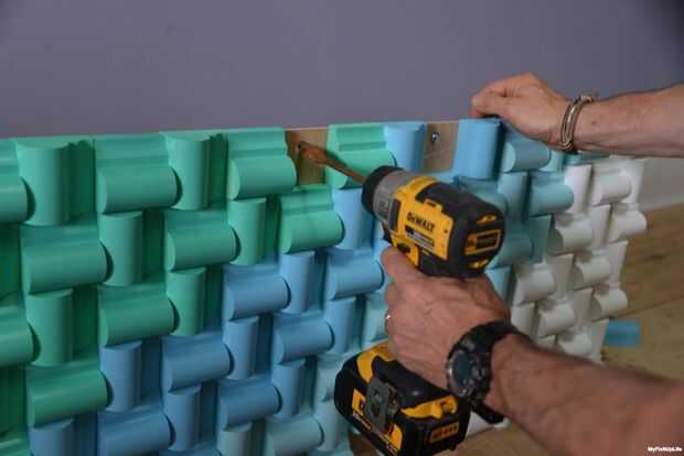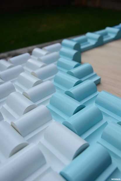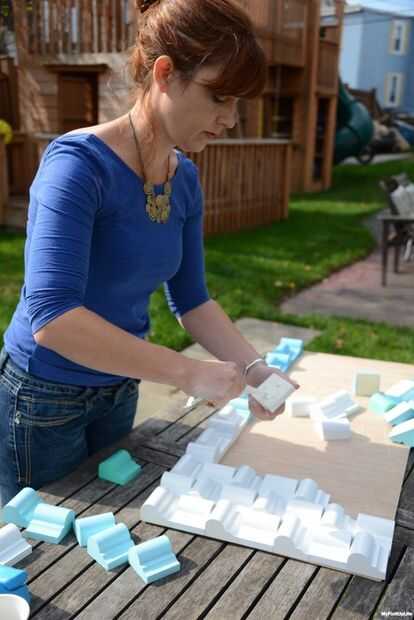 Así que después de cortar muchos bloques pequeños de unos trozos de moldura, aerosol pintado de pequeñas piezas en colores y pegado a un soporte. He dejado algunas de las piezas de soporte, por lo que sería un lugar para fijar a la pared. Y puntos de pegamento para asegurar las piezas después de que colgó. Con el GlueDots, fácilmente puedo quitar esos bloques poco si alguna vez quiero cambiar hacia fuera el arte de la pared bajo el mantel. Es una clara posibilidad, teniendo en cuenta mi actual obsesión con arte de pared de vacaciones.