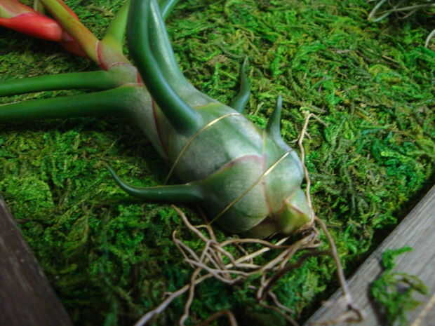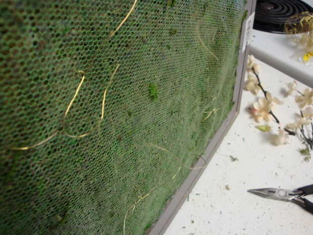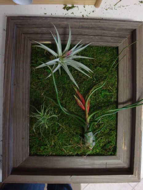 Ahora es el momento de averiguar si le gustaría crear una obra de arte vertical u horizontal. Asegúrese de tener en cuenta dónde está su gancho en la parte posterior del marco. Decidir en un arrangment de la planta una vez como su elegido la orientación. Seguro las plantas en su lugar con alambre fino, usted debe ser capaz de enviar fácilmente el alambre a través de la hoja de musgo. Me envolvió mis plantas dos veces y luego el alambre torcido en el reverso para garantizar.