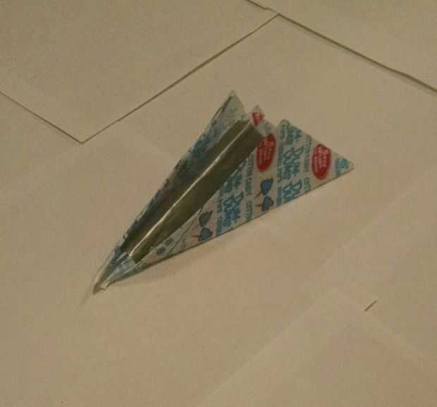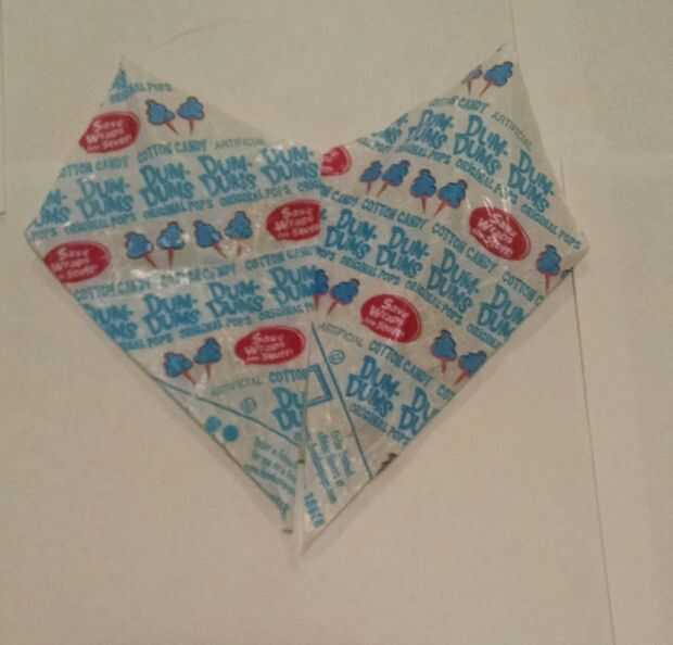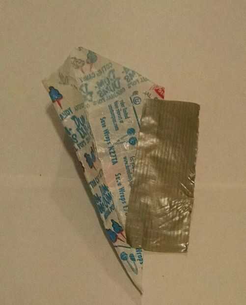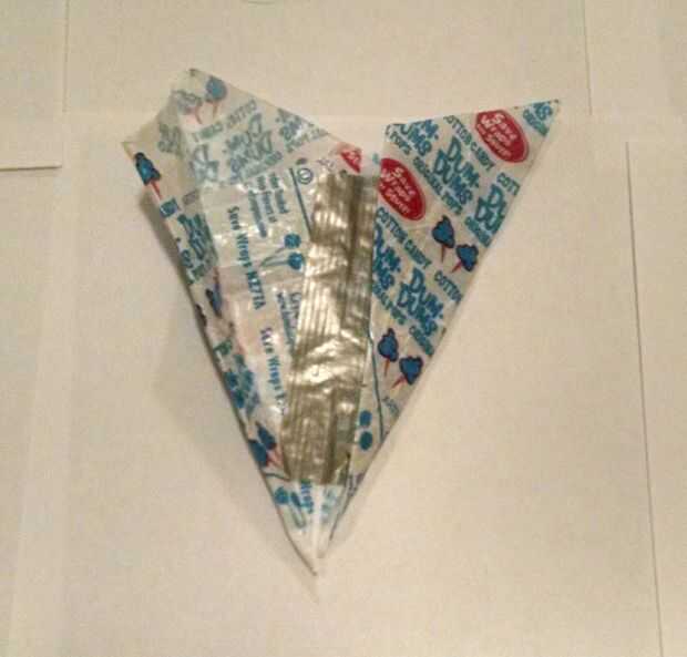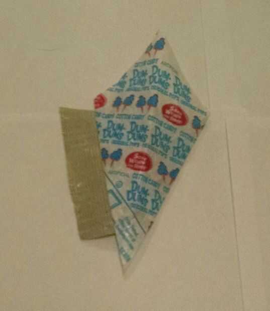2. abrir el triángulo para que las 2 aletas muestran y coloque un trozo de cinta en el lado derecho del triángulo, el lado pegajoso por debajo como se muestra