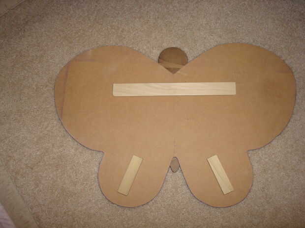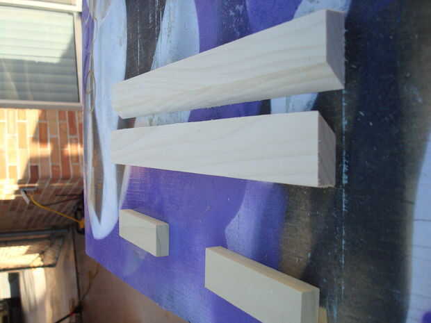 Corte 1/2" álamo con un bisel 45 de grados en la Sierra de mesa. También cortar trozos más pequeños para colocar en la parte inferior de la ilustración para mantenerla paralela a la pared. Montar y pegar las piezas en la parte posterior de la obra de arte. Tenga cuidado de montar la pieza biselada exactamente horizontal.