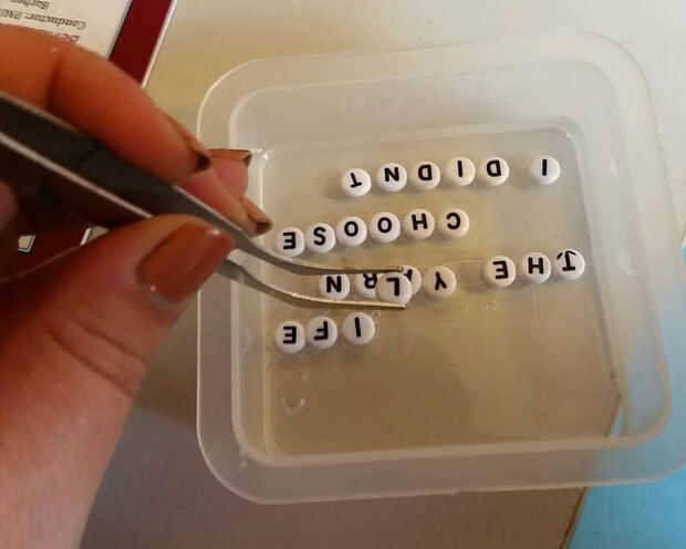 Mientras la primera capa de resina, es averiguar cómo quiere organizar su diseño. Asegúrese de que tener espacio suficiente para colocarlo todo en allí! Me pareció útil para poner las letras al revés así que el estaría frente a la manera correcta de la parte delantera. Esto era algo confuso, pero fue super útil para configurarlas así ante mano por lo que no estaba tratando de averiguar lo que estaba haciendo cuando los fui fijando en la resina.