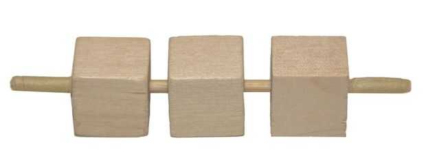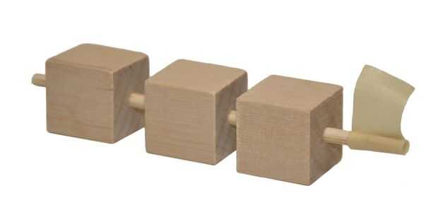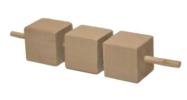 La bisagra para el brazo de la trampa es creada por enhebrar un pincho fino a través de tres cubos con agujeros. Se envuelve un pequeño trozo de cinta en los extremos de la brocheta para evitar que los cubitos de deslizamiento.