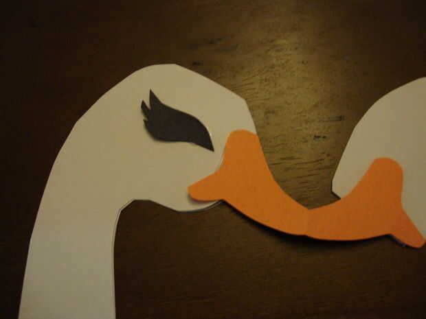 Ahora es el momento para cortar las pestañas de cisnes. Tome un pedazo de papel de construcción negra y cortar dos ojos utilizando la plantilla.
