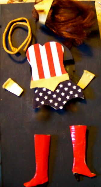 Tuve que hacer una peluca, que ajuste con tiara. Hice varios cambios y sombreros. Estoy muy orgullosa de las pequeñas botas rojo con tacones (encontrado en la parte posterior de las palancas pequeñas marco vuelta para foto de marco es los talones...