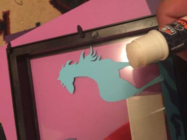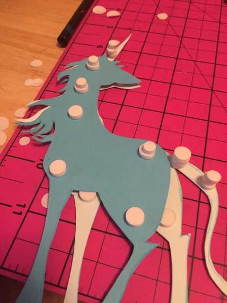 · Se aplican las capas de círculos adhesivos de espuma a cada capa de color de la imagen. Dependiendo de donde se colocará cada forma determina el número de círculos de espuma para poner uno encima de otro apoyo.