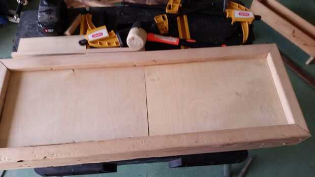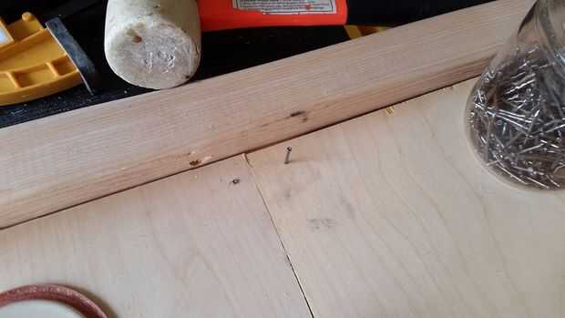 Cortar el 1/4" madera contrachapada para que encaje perfectamente en el medio. Cada pieza debe cortarse a la mitad de la longitud de la parte interior del marco y asegura en cada esquina con clavos de acabado.