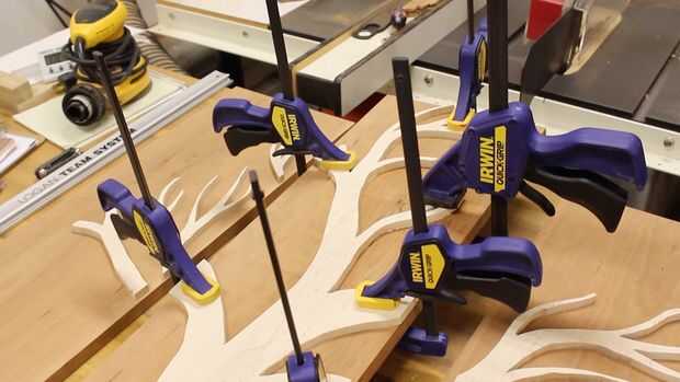 Utilicé cinta para evitar las juntas alineadas arriba y pegarles. Tómese su tiempo y asegúrese de no mover las piezas del árbol al sujetar los paneles de cereza. Esto es crucial para la alineación de los paneles y ramas.