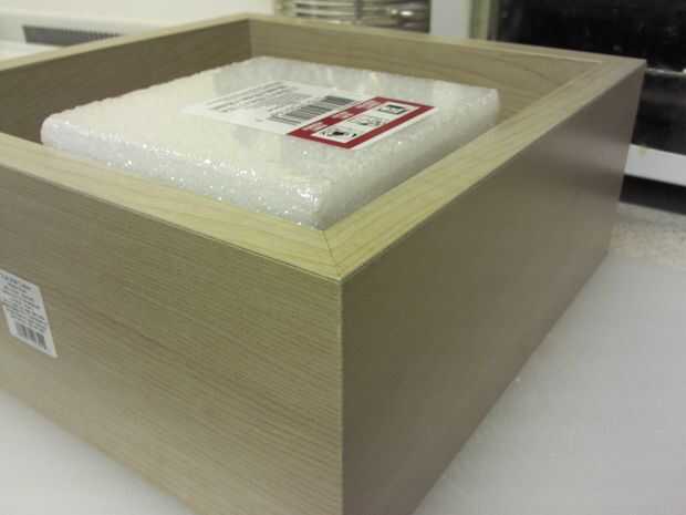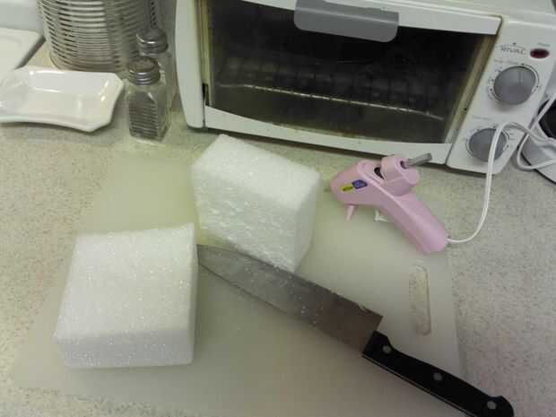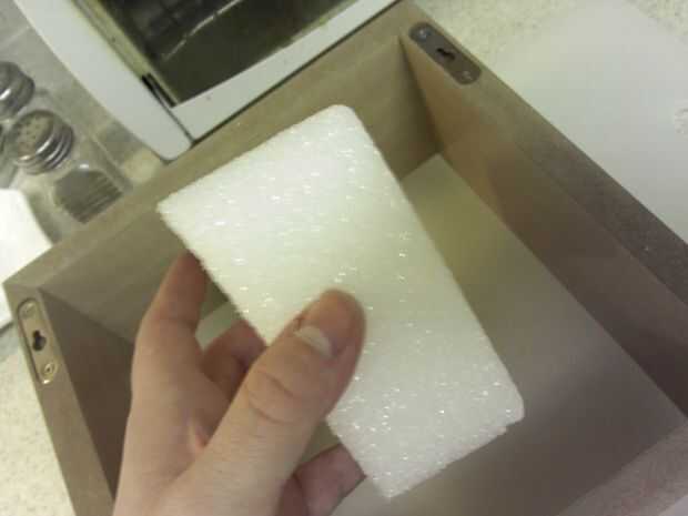 No desea la espuma para tomar el cubo entero, y sólo debe estar al ras con el frente del cubo (no desea que se pega hacia fuera).  Cortar un cubo por la mitad, luego cortar cada cuadrado de la "Flaca" en pedazos.