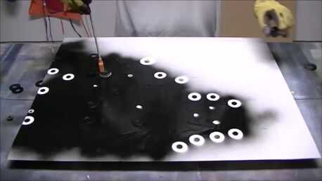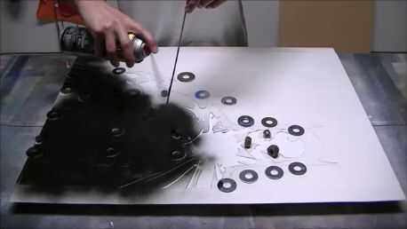 Usé algunas arandelas para pesar abajo la plantilla para el MDF, esto le ayudará a salir de las líneas de la pintura más claras. Como pinté solía un palillo para pisar diferentes secciones otra vez para tratar de crear una línea limpia. Una vez que terminé usé un imán para recoger las arandelas.