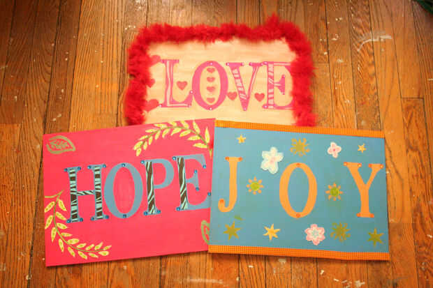 Para el tablero de "Amor", usé pintura de tono carne y unos pocos trazos rápidos de blanco para la dimensión. He pintado la palabra amor en pintura color de rosa caliente y añadir unos corazones rojos alrededor de él. También añade las tiras de cartulina impresos cebra rosa para las líneas rectas en L, V y E y añade pedrería rosa. Finalmente, acabada con un borde rojo de plumas de boa.