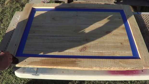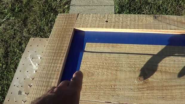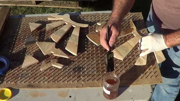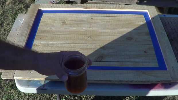 Dentro del marco de cinta y mancha exterior con vinagre y lana mezclados entre sí. También se tiñen las partes de ave con la mezcla de lana y vinagre. Apliqué dos capas para una mirada más oscura. Deje que seque durante la noche.