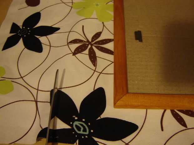 Encontrar la pieza de la tela que se va a usar y cortar un área que es de unos 5cm (2 pulgadas) más grande (ancho y alto) que el marco.