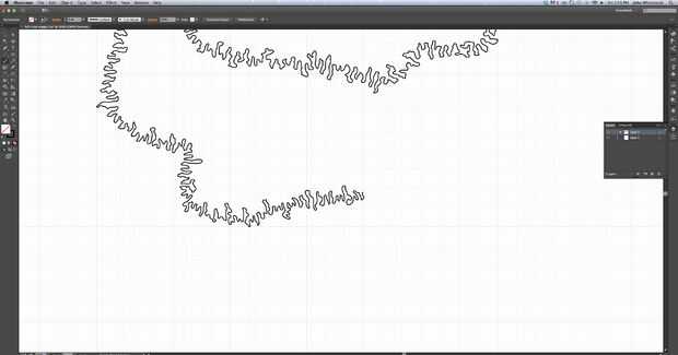 Haciendo referencia a varias imágenes de las fisuras del cráneo, dibujó el patrón en Illustrator con la herramienta pincel. Cuando todo estaba a mi gusto, la preparé para la máquina de chorro de agua Omax añadiendo puntos de anclaje adicionales (objeto > ruta > Añadir puntos de ancla) y guardarlo en formato legacy Illustrator 8.