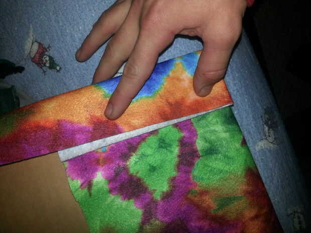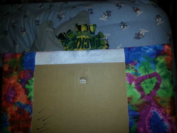 Tenía un viejo cartel que venía del tablero de tarjeta usé. Tuve que recortar esto por lo que será suficiente tela para envolver detrás de él. Esto es bastante sencillo. Es un poco como rapear un presente. Lo importante es asegurarse de que la tela plana en la parte delantera y en la parte posterior fueron vas a prenderlo. Asegúrese de que usted tiene por lo menos dos pulgadas por todos lados para doblar sobre. Cartulina funciona muy bien porque las clavijas de palo bueno en él. Si la tela está arrugada puede planchar antes de hacer. Asegúrese de que usted es la tela está hacia fuera ward la forma que desee en su cartulina. Centro de su tela, así que hay la misma cantidad a cada lado. Doblar sobre plano como pin hasta el cartón wraping un regalo. Precisar la tela a lo largo de la parte superior donde se dobla sobre. Luego ir a la parte inferior y estire a la tela, doblar y precisar. Luego ir a ambos lados y fijar a la tela al cartón. Cubrió a la tela en un ángulo para que el pin a cabo pero no pega en la parte delantera del lado. Luego a colgar en la pared. ya que usé un cartel más viejo tenía una cosa para colgar de lo contrario podría la tachuela.