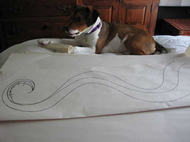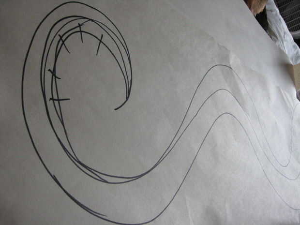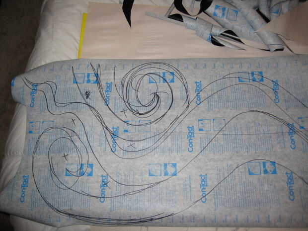 Por lo tanto, para hacer el primer remolino, con cinta adhesiva un pedazo de papel de periódico en el lugar de destino. Pliegue el papel en la unión entre las paredes para tener el papel en dos superficies, así que ayudarle dibuje en las dimensiones. Utilizando el lápiz, bosquejado el remolino como deseé que aparezca en el área. . También dibujé una línea a lo largo del pliegue en th ewall (si está en un pliegue) para ayudarme Alinee el papel de contacto con la esquina más adelante.