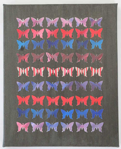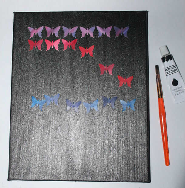 Utilice el lápiz para marcar donde sobre que vas a colocar las mariposas, tengo 6 mariposas que encajan muy bien en el lienzo - dependiendo del tamaño del lienzo puede que necesite más para colocar en el lienzo. En el lienzo negro usé una pluma de plata para agregar un diseño a la mariposa.
