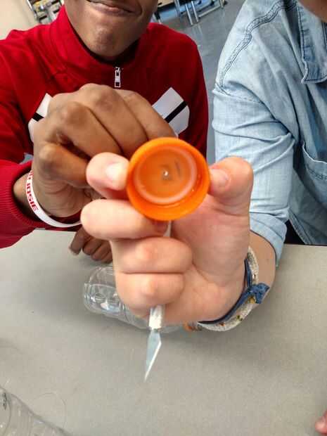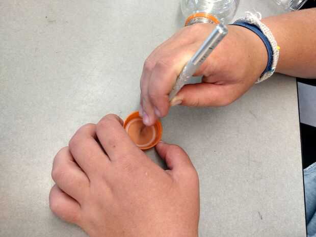 1. Usando un cuchillo X-acto, orificio en la parte inferior de cada una de las tapas. (Asegúrese de que los agujeros son bastante grandes para que la pintura pueda salir sin problemas).