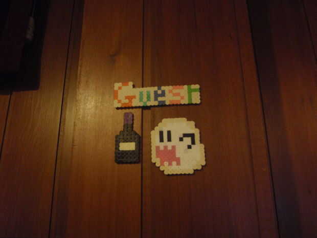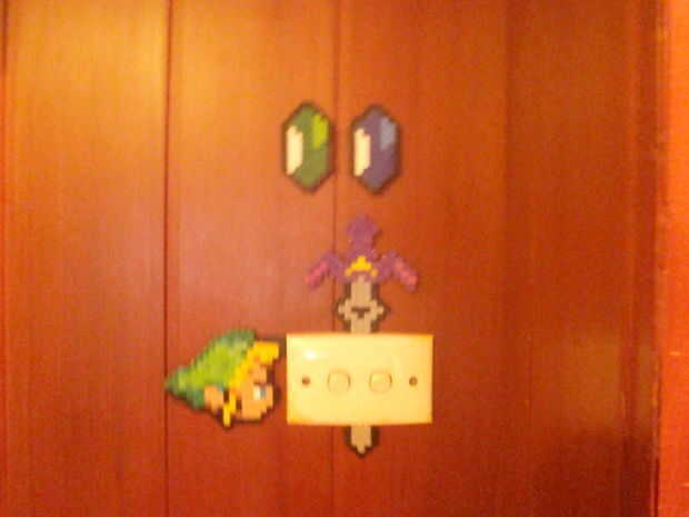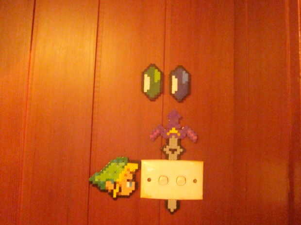 esto es solo algunos arte pixel hice usando cuentas que cuando se plancha, se funden. Tengo algunas rupias, una espada maestra, link, una enredadera, boo y una botella de vino hecho de mi amigo. son blu-con tachuelas a las paredes de nuestro sótano. Son todos de juegos de video excepto la botella de vino.