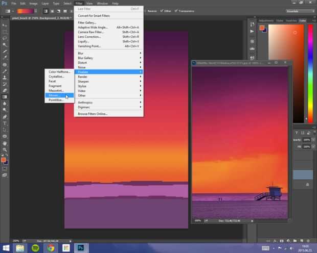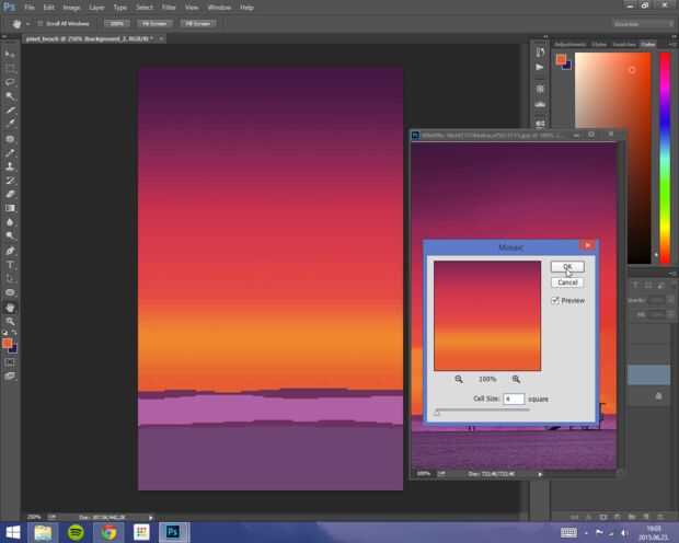 Haga clic en filtro y seleccione Pixelizar y mosaico. Establecer el tamaño de celda "a su gusto" (me puse a 4) y haga clic en Aceptar.