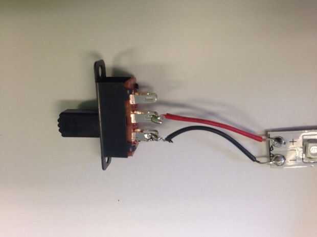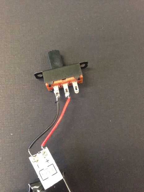 Usé un mini interruptor para encender los pedazos de centro y apagar. Un extremo está conectado al cable negativo (negro) en un extremo de la tira de LED y el cable positivo (rojo) está conectado a la pata del media.