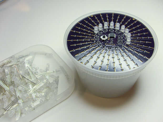 A continuación, inserte los LEDs desde el círculo más interno. Voltee y soldadura. Luego conectar la alimentación y compruebe si todos los LEDs están trabajando. Repita hasta que usted soldar todos los LEDs.