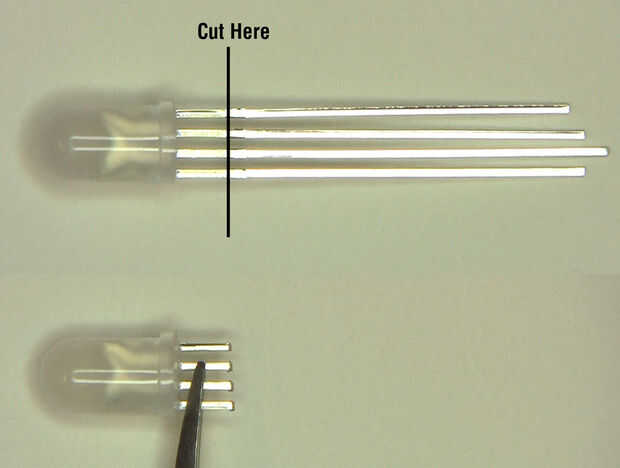 Ahora tratar de mantener la cabeza fría y continuar con la Asamblea. Ahora quite los 9 LEDs que probado con. Es necesario cortar los cables de los LEDs antes de insertar en la PCB, como el cuadro demostrado.