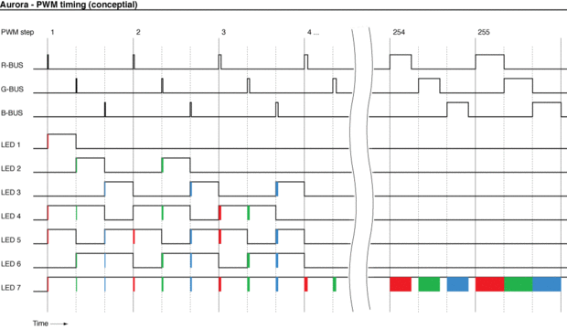 Como se puede ver, autobuses R/G/B suban momentáneamente, tomar vueltas. Estos impulsos controlan la duración real que LEDs se iluminan. Cada conductor común de los LED controla si este LED se encenderá durante el período que autobuses R/G/B alta. El tiempo real que LEDs se iluminan están marcados con el color de la tabla.