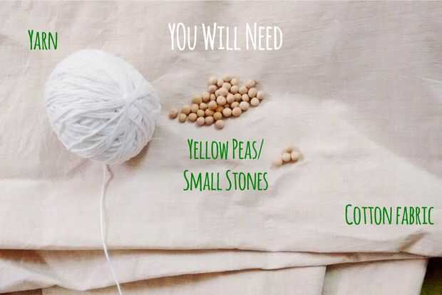 Un paño de algodón dyeable, alguna cadena y muchos pequeños granos redondos. He usado guisantes amarillos secos porque tenían el tamaño perfecto que necesitaba, se puede utilizar nada, alrededor piedras trabajo así!
