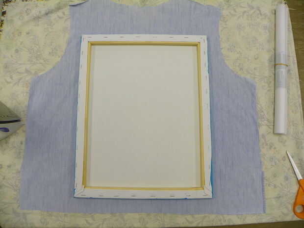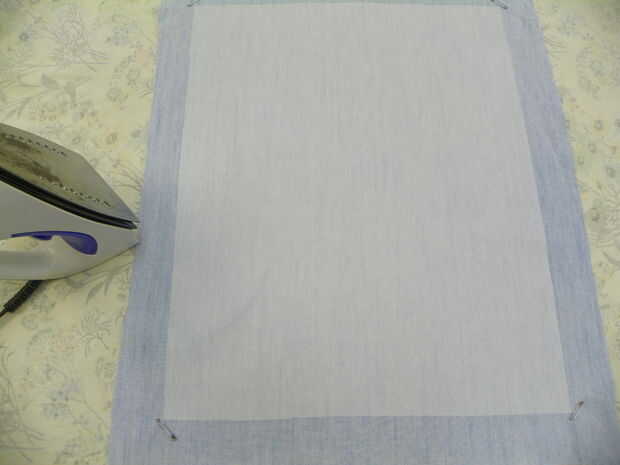 Para la pieza del fondo, permite 2" extra en los 4 lados para envolver alrededor y pegado a la parte posterior. Coloque un pasador de seguridad que serán las esquinas de la lona. Hierro en algunos fusibles correas, lado de papel hacia arriba, al revés de la tela. Desprenda el papel y coloque un pedazo de tela sobre esto. Este hierro abajo. Este paso consolida a la tela sin el adición de bulto a los lados y las esquinas.
