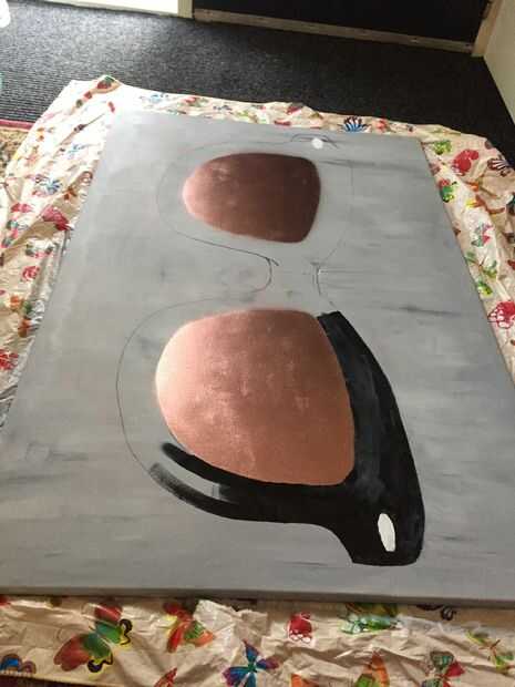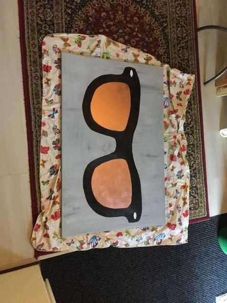 Nunca he pintado en mi vida, así que esta parte era un riesgo para mí. Tomé una forma de rayban de Internet, hizo un recorte y utilice un spraypaint cobre metálico para las gafas, el resto es pintura acrílica base.