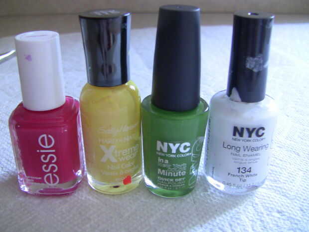 En este DIY, le iré a través de un lindo pastel primavera Nail Art design. Esto es bueno para principiantes y artistas de uñas avanzado, por lo que no te preocupes!Paso 1: productosSe necesita:4 diferentes colores de esmalte de uñas (los colores y ma