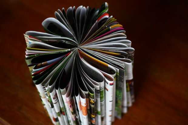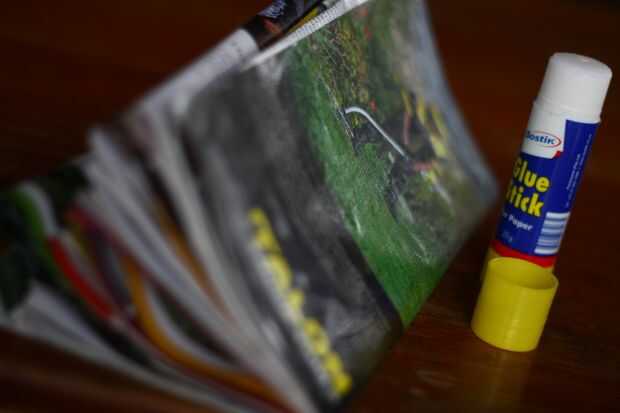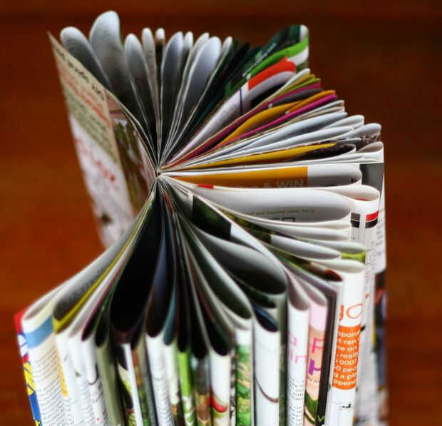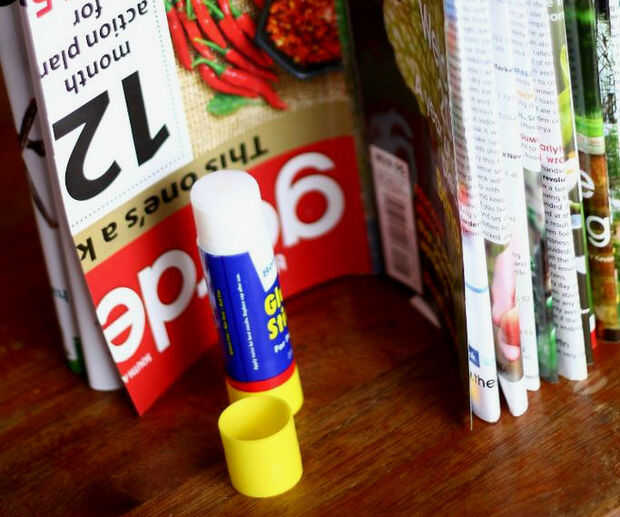 Utilice el pegamento para pegar la portada y página de las dos revistas de nuevo juntos. Verticalmente y pegar la portada y página juntos. Ahora tienes un cilindro de papel hermoso.
