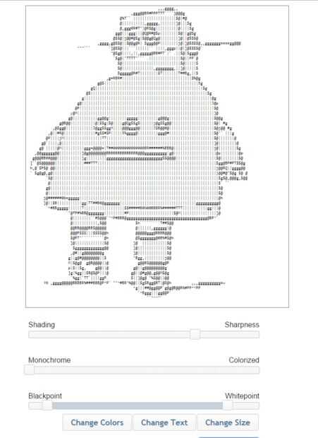 El primer paso es elegir la imagen. Para este artículo, vamos a utilizar el robot viejo buena Instructables. Para el trabajo bruto, usamos http://asciiart.club/ para generar la primera versión de nuestro arte ASCII. Se selecciona la imagen en su computadora y haga clic en el botón "Ir". Se creará una versión de él utilizando la configuración predeterminada de este sitio. Usted tendrá, en el orden en que aparecen justo debajo del arte de escuchar, reguladores para el control de nitidez, el color y la intensidad de la luz y la oscuridad de la imagen original. Debajo de ellos, ajustes de color, texto y dimensiones además de botón regenerar para aplicar los cambios realizados en los 3 cursores.