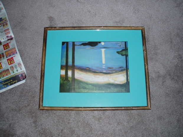 El paisaje de impresión era un poco más pequeño que el cartel del concierto pero el cuadro era lo suficientemente grande. Así que tomé el marco aparte y retirar la impresión. Dejando de lado el vidrio mateado y respaldo, a poner el marco encima de unos papeles de ventas vieja y se puso a trabajar.